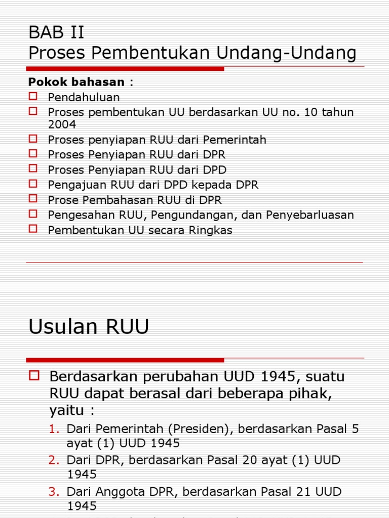 Setelah dilakukan 4 kali perubahan, uud 1945 memiliki pembukaan, isi (16 bab, 37 pasal, 194 ayat), aturan peralihan (3 pasal), dan aturan tambahan (2 pasal). Seperti dijelaskan pada bagian sebelumnya, lembaga perwakilan rakyat atau parlemen disebut dengan berbagai macam istilah sesuai dengan bahasa yang dipakai di setiap negara. Bentuk, susunan, kedudukan, dan kewenangannya beragam sesuai dengan. Secara garis besar proses pembentukan uu terdiri atas : Sebuah ruu bisa berasal dari presiden, dpr atau dpd. Berdasarkan uu 12/2011 tentang pembentukan peraturan perun. Semoga dengan pengetahuan ini membuat kita lebih bijak dalam menyikapi. Tugas perancangan peraturan negara proses pembentukan undang undang dan peraturan daerah oleh: Peb, cnn indonesia | kamis, 08/10/2020 21:09 wib. Kejutan syed saddiq menggemparkan parlimen dan undang undang malaysia. Yannes putra simanullang (1206209394) fakultas hukum universitas indonesia 2016 proses pembentukan undang undang dan peraturan daerah 1. Kelima, bidang kuasa imigresen terletak ke atas kerajaan persekutuan, namun kuasa autonomi ini hendaklah diberikan kepada sabah dan sarawak. Filipina menuntut sabah yang menganggap ia sebahagian wilayahnya.